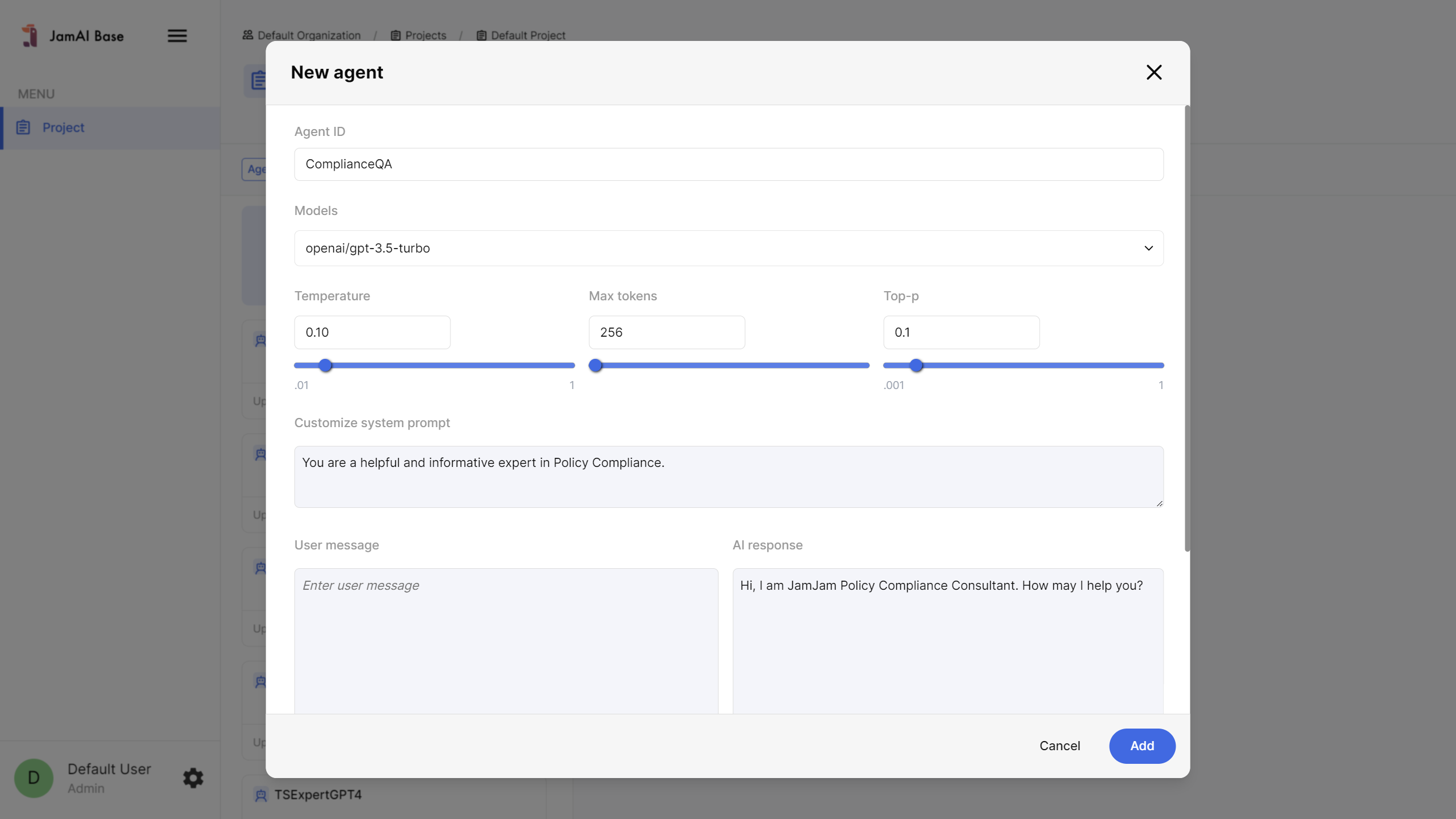 * User message (<mark style="color:orange;">optional</mark>): Set a first reply to your LLM Agent.